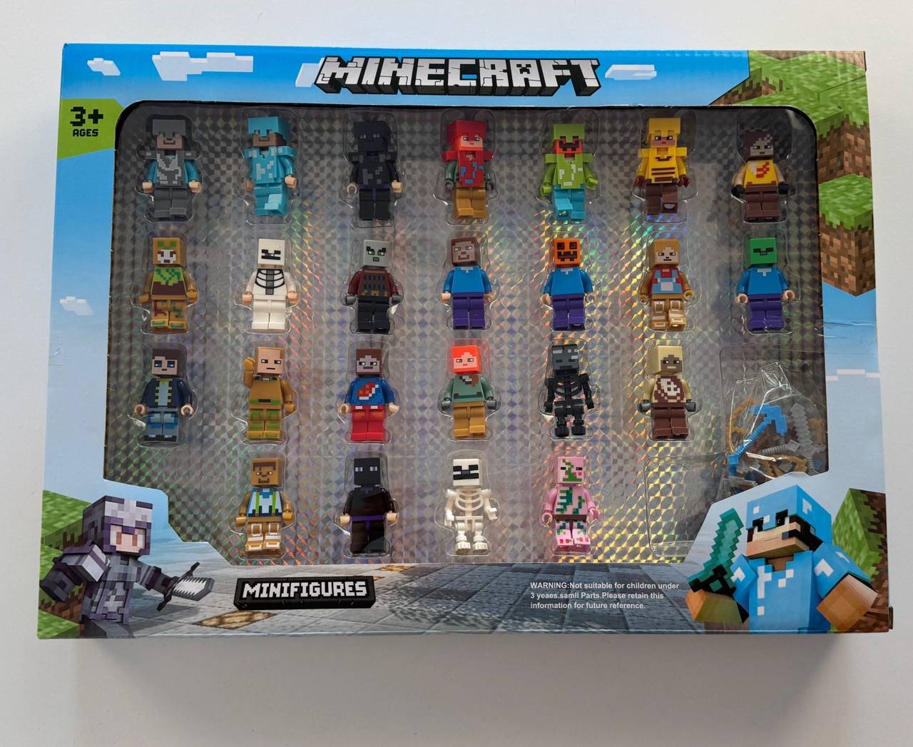 Цей великий набір містить 24 мініфігурки, натхненні популярною грою Minecraft. Фігурки виконані у піксельному стилі, знайомому фанатам гри, і включають різноманітних персонажів, істот та героїв з різними скінами. У комплекті також є зброя та інструменти (мечі, луки, кирки, лопати), що додає реалістичності ігровому процесу.